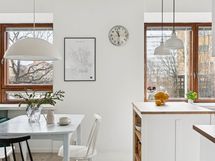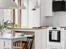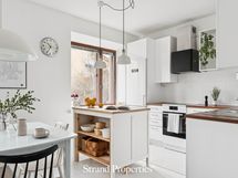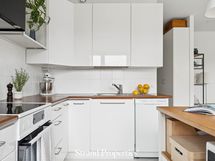 - Kaapistot, välitila laatoitettu, jääkaappipakastin, keraaminen liesi, liesituuletin, astianpesukone, lisäksi saareke, jossa on paikka mikroaaltouunille. Maalattu laattalattia.
