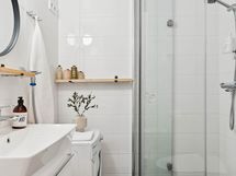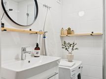 - Pesutilojen kuvaus: Kylpyhuone saneerattu putkiremontin yhteydessä 2022. Kylpyhuoneessa laattalattia, lattialämmitys (sähkö) ja seinät kaakeloitu. Suihku, suihkuseinät, allaskaapisto, peili, hyllyt pesukoneliitäntä, pyyhekuivain (sähkö) ja wc-istuin.