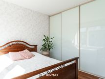MAKUUHUONE on suuri ja siellä on koko seinän leveydeltä liukuovikaapistoja.