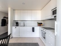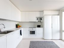 - Tilaa isolle ruokapöydälle, Paljon kaappitilaa, Paljon työskentelytilaa, Laminaattitasot, Astianpesukone, Liesi tai uuni erikseen, Liesituuletin, Induktioliesi, Jääkaappi, Pakastin