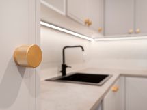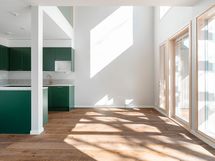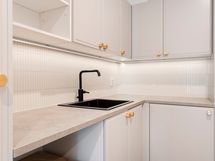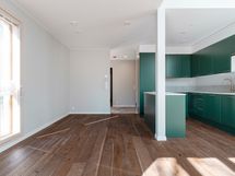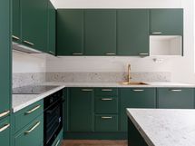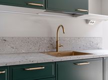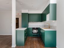 - Keittiön varusteet: Jääkaappipakastin, uuni, liesi, liesituuletin, mikroaaltouuni, astianpesukone ja keittiösaareke. Liesi: Induktioliesi. Työtason materiaali: Laminaatti. Topi-keittiön kaapistot (sävy: havunvihreä) messinkisillä vetimillä ja integroiduilla kodinkoneilla.