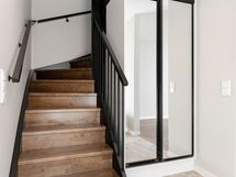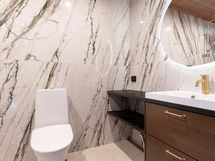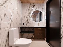 - Pesutilojen varusteet: WC-istuin, suihku ((harjattu messinki)), pesuallas, peili, lattialämmitys, suihkuseinä, allaskaappi ja bidee-suihku. Erillisen WC:n kuvaus: Alakerran erillinen wc: