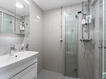 - Kylpyhuone/wc, suihku (taittuvat seinät), peilikaappi, pesukoneliitäntä, mukavuuslattialämmitys, käsienpesuallas, bide-suihku, allaslaatikosto, kiinteät valaisimet