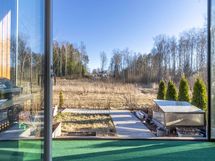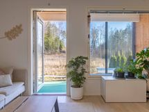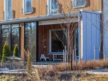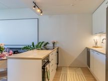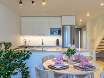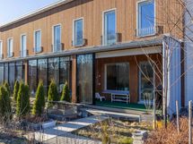 Asunnon keittiöruokailutilaolohuone-yhdistelmässä on tyylikkäät vaaleat pinnat ja Topi-keittiö varustettuna nykyaikaisilla kodinkoneilla ja viinikaapilla. Työtasolta löytyy induktiotaso liesituulettimella, joka pitää tilan avarana. Ruokailutila ja olohuone avautuu aurinkoiseen suuntaan leveälle ja valoisalle lasitetulle terassille. Valoisalla terassilla ja piha-alueella voit nauttia auringosta omassa rauhassa ja vilvoitella oman saunan lämmöstä. Täällä on rauhallista ja viihtyisää ja ulkoilu-alueet alkavat heti omalta ovelta.