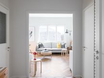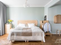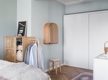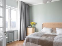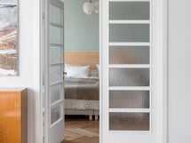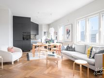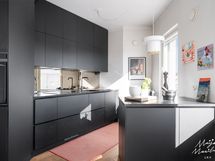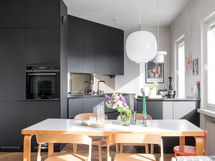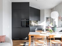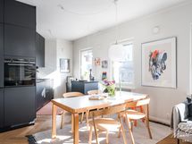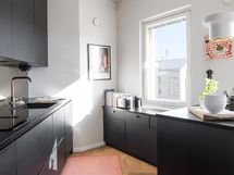 Kalanruotokuvioinen öljytty tammiparkettilattia, maalatut seinät. KVIK-keittiön kaapistot. Kalusteisiin integroidut Siemensin jääkaappi, pakastin, induktioliesi integroidulla liesituulettimella, uuni (pyrolyysitoiminto). Bosch-astianpesukone ja Witt-viinikaappi. Graniittitasot (nahkahiottu). Hana Tapwell.