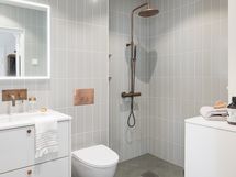 Lattia ja seinät laatoitettu. Allas, Tapwell-allashana, Nixi-allaslaatikosto, Nixi-pyyhekaappi, peili, Tapwell-suihku. Seinäkiinnitteinen IDO-wc-istuin. Pyyhepatteri ja pesukoneliitäntä. Sähkötoiminen lattialämmitys.