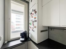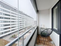 Pohjaratkaisu on käytännöllinen ja tilantuntuinen. Koko asunnon levyinen lasitettu parveke tuo mukavasti lisätilaa asumiseen ja tarjoaa viihtyisät näkymät itään. Hyvin varustellussa keittokomerossa on runsaasti kaappi- ja säilytystilaa.