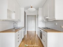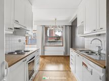 - Työtaso: laminaattitaso. Kaksi jää-pakastinkaappia, astianpesukone, liesituuletin/aktiivihiilisuodatin, sähköliesi ja uuni.