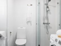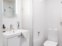 Laatoitetut seinät ja lattia. Suihku ja suihkuseinä. Allas, allashana, bideesuihku, allaslaatikosto, peilikaappi ja wc-istuin. Lattialämmitys, pesukoneliitäntä.