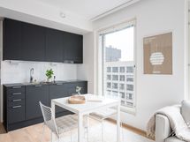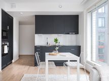 Maalatut seinät ja parkettilattiat. Mustat keittiökaapistot. Allas, allashana. Jääkaappi-pakastin, astianpesukone, uuni, mikroaaltouuni ja liesi. Liesituuletin. Laminaattitasot.