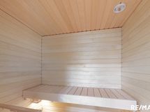 - Viihtyisä sauna, jossa on sähkökiuas ja lauteet. Lattia on laatoitettu ja seinät ovat puupintaiset, mikä luo lämpimän ja perinteisen saunatunnelman.