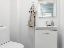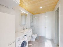 - Pesutilojen kuvaus: Tyylikäs ja tilava kylpyhuone tarjoaa toimivat pesutilat, ja sieltä on käynti omaan saunaan. Varustukseen kuuluvat allas, allaskaappi, wc-istuin, bide, suihku, suihkuseinä, peilikaappi, korkea kaappi sekä pesukoneliitäntä. Lattia on laatoitettu ja seinät ovat kauttaaltaan kaakelia, mikä tekee tilasta helppohoitoisen ja ajattoman. Erillisen WC:n kuvaus: Erillinen wc on varustettu wc-istuimella, altaalla, allaskaapilla, peilikaapilla ja bideellä. Lattia ja seinät on kauttaaltaan laatoitettu, mikä tekee tilasta helppohoitoisen.
