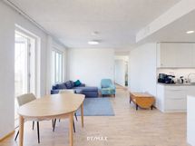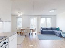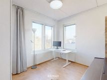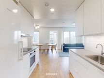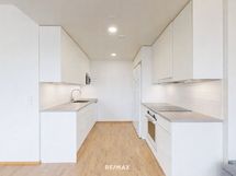 - Keittotila on käytännöllinen ja tarjoaa runsaasti kaappi- ja laskutilaa arjen sujuvaan ruoanlaittoon. Varustukseen kuuluvat jääkaappipakastin, kiertoilmauuni, induktioliesi, astianpesukone, mikroaaltouuni ja liesituuletin. Lattiamateriaalina on laminaatti, ja seinät on maalattu vaalein sävyin, jotka tuovat tilaan raikkautta ja helppoa sisustettavuutta.