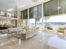 - Kuvaus: Tilava sauna sijaitsee talon yläkellarissa. Saunasta on upea näkymä uima-altaan ja nurmipihan yli merelle. Saunan lauteet, seinät ja katto ovat puupaneelia, lattia on keraamista laattaa. .