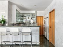 - Isokokoisessa ja valoisassa keittiössä on valkoiset korkeakiiltoiset kaapistot ja graniittitasot. Kaapistojen välitila ja lattia on tyylikästä marmoria.