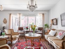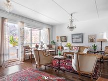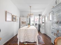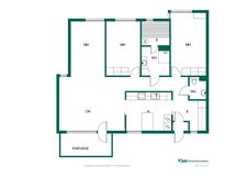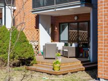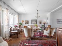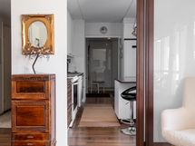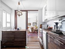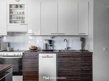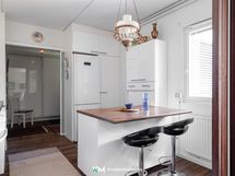 - Jääkaappi/viileäkaappi, pakastekaappi, liesi, liesituuletin/ aktiivihiilisuodatin, astianpesukone, kaapistot. Lattia: laminaatti. Seinät: Maalattu