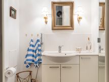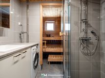 - Varusteet: WC, suihku. Suihku/suihkukaappi, peilikaappi, pesukoneliitäntä, sauna, erillinen wc. Lattia: Laatta, . Seinät: Laatta, maalattu