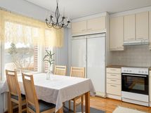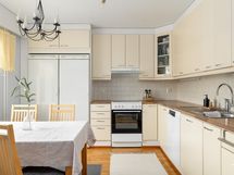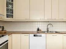 Liesi: keraaminen. Työtasot: laminaatti. Kylmäsäilytys: jääkaappi, pakastin. Varustus: astianpesukone, liesituuletin / hormi.