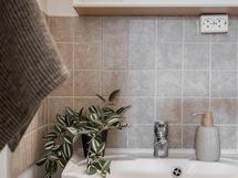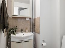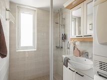 - Kylpyhuone, erillinen wc, suihku, suihkuseinä, peilikaappi, kaapit, allaskaappi, pesukoneliitäntä, lattialämmitys, kiinteät valaisimet.