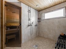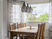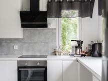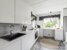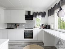 - Keittiön varusteet: Jääkaappi, erillinen pakastin, liesi, astianpesukone, liesituuletin, mikroaaltouuni ja erillisuuni. Työtason materiaali: Laminaatti.
