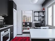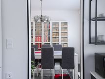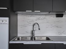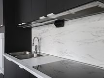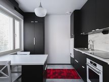 - Keittiön varusteet: Jääkaappipakastin, liesituuletin, astianpesukone, keittiösaareke, liesi ja uuni. Liesi: Induktioliesi. Työtason materiaali: Laminaatti.