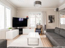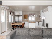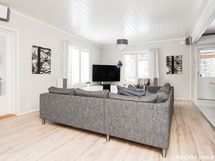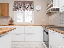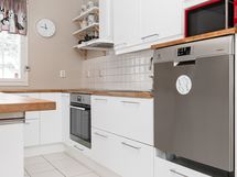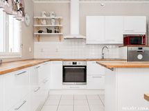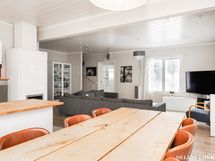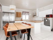 Kodissa on hyvin varusteltu keittiö, jossa massiivitammiset työtasot tuovat arvokkuutta ja kestävyyttä. Keittiössä on tilaa ruokapöydälle ja se avautuu saumattomasti olohuoneeseen. Keittiöstä on käynti taloa kiertävälle terassille, joka kutsuu nauttimaan vuodenajoista. Olohuoneen ja keittiön sydämenä toimii kaunis varaava takka, joka luo lämpöä ja tunnelmaa.