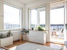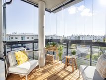 - Lasitettu parveke, Tilava lasitettu parveke kaakko/lounas suuntaan. Parvekkeella sälekaihtimet. Lattialla irroitettava lämpökäsitellystä puusta tehty laudoitus. Viilentävän ilmalämpöpumpun ulkoyksikkö. Kattovalo ja 2 sähköpistoketta sisäkytkimellä.