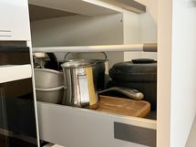 - Paljon säilytystilaa, siivouskomero, eteisessä peili-ovilla varustettu vaate- ja säilytyskaapisto, makuuhuoneessa 5 korkeaa kaappia ulosvedettävillä vetokoreilla, vaate-tankomekanismeillä ja hyllyillä. Keittiössä erillinen ruokakomero, ja vetokoreilla varustetut astiakaapit joihin tavarat mahtuu hyvin.
