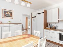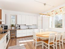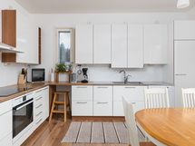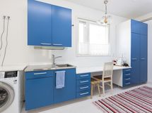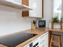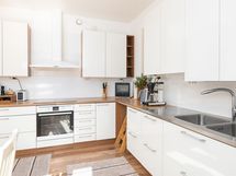 Liesi: induktio. Työtasot: laminaatti. Kylmäsäilytys: pakastin, kylmiö. Varustus: liesikupu, astianpesukone.