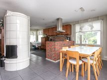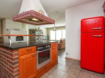 B-talo: kaapistot, Smeg jääkaappi/pakastin, keraaminen liesi, erillinen uuni (rikki), liesituuletin, integroitu astianpesukone, mikroaaltouuni, saareke, leivinuuni ja kivi- ja puutasot. Lattia laattaa, välitilassa kivilaattaa, seinät tapetoitu ja maalattu.