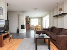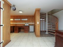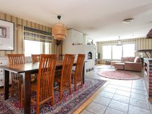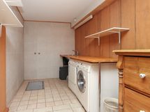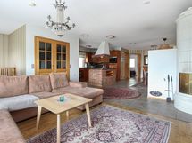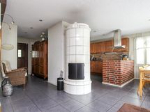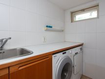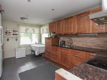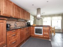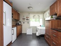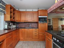- A-talo: kaapistot, jää/viileäkaappi, pakastin, induktioliesi, kiertoilmauuni, astianpesukone, liesituuletin ja kivitasot. Lattia laattaa, välitilassa kivilaatta, seinät maalattu.