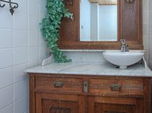 - Pesutilojen kuvaus: Talo A: kph/wc ensimmäisessä kerroksessa: suihku, suihkuseinä, wc-istuin, pesuallas, allaskaappi, peilikaappi ja bidee. Kylpyhuone kellarissa: kaksi suihkua ja ikkuna. Lattia ja seinät laatoitettu.