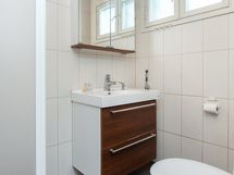 Talo B: wc-istuin, pesuallas, allaskaappi, peili. Lattia ja seinät laatoitettu.