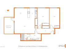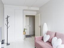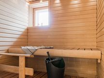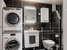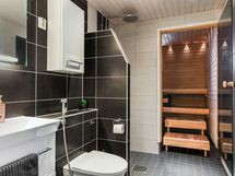 - Sauna, sähkökiuas, kylpyhuone, suihku, suihkuseinä, peilit, kaapit, allaskaappi, pesukoneliitäntä, lattialämmitys, kiinteät valaisimet.
