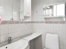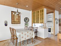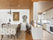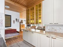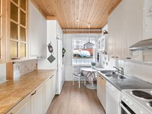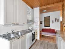 Keittiön varusteet: Jääkaappipakastin, liesi, uuni, liesituuletin ja astianpesukone. Liesi: Sähköhella. Työtason materiaali: Laminaatti.