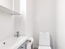 - Pesutilojen varusteet: Suihku, peilikaappi, pesuallas, allaskaappi ja pesukoneliitäntä. Pesutilojen kuvaus: Kylpyhuone remontoitu 1/2003. Erillisten WC:n lukumäärä: 1. Erillisen WC:n varusteet: WC-istuin, peilikaappi, allaskaappi ja pesuallas.