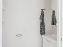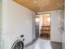 - Saunassa heti valmis kiuas. Pesuhuoneessa kaksi suihkua, pesukoneliitäntä, kiinteät valaisimet. Erillisessä wc:ssä peili- ja allaskaappi, kiinteät valaisimet.