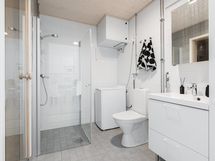 Pesutilojen varusteet: WC-istuin, suihku, suihkuseinä, pesukoneliitäntä, lattialämmitys, bidee-suihku ja pesuallas.