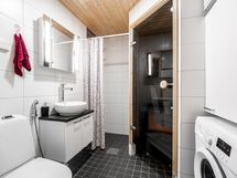 - Kylpyhuone, suihku, peilit, pesukoneliitäntä, lattialämmitys, kylpyhuonekaapisto, kylpyhuonekaapisto, sähkösauna