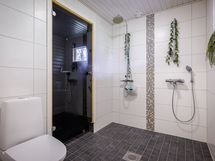 Varustus: lattialämmitys, wc-istuin, suihku. Erillisen WC:n kuvaus: seinämallin wc-istuin. Varustus: lattialämmitys, peilikaappi, bidee-suihku.