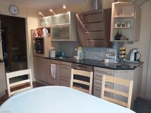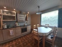 Tilaa isolle ruokapöydälle, Paljon kaappitilaa, Paljon työskentelytilaa, Laminaattitasot, Sähköliesi, Jääkaappi