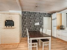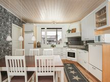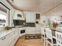 - Keittiön varusteet: Jää-viileäkaappi, liesituuletin, astianpesukone, liesi, erillisuuni, leivinuuni ja keittiösaareke. Liesi: Keraaminen liesi. Työtason materiaali: Laminaatti. Puustellin keittiö.