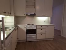 - Tilaa isolle ruokapöydälle, Paljon kaappitilaa, Paljon työskentelytilaa, Suuri tiskipöytä, Astianpesukone, Laminaattitasot, Sähköliesi, Jää-pakastinkaappi