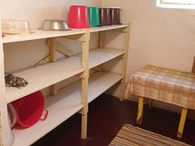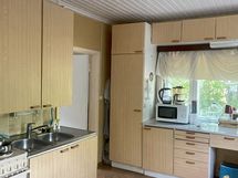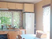Keittiön kaapistojen ovet ovat melamiinipinnoitetut. Keittiön varusteina jää/viileäkaappi ja sähköliesi. Asuintilojen lattiat ovat muovimattoa.