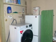 Pesukone ja lämminvesivaraaja kellarissa pyykkitilassa.