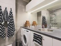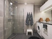 Suihku, Suihkukaappi, Pesukone, Lattialämmitys, Laattaseinä, Laattalattia,Ylä- ja alakaapistot.