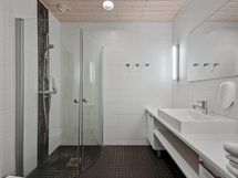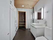 - Kylpyhuone, suihku, peilikaappi, pesukoneliitäntä, lattialämmitys, kylpyhuonekaapisto, kiinteät valaisimet, erillinen wc, sauna