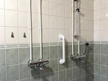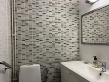 - Tilavassa kylpyhuoneessa on suihku, paikka pyykinpesukoneelle, kaapisto ja wc-istuin. Saunassa on sähköllä lämpiävä kiuas. Eteisaulassa on erillinen wc. Kylpyhuoneessa on lattialämmitys sähköllä. Kylpyhuoneessa on laatoitettu sekä lattia että seinät vanhan laatoituksen päälle. Samoin saunan lattialaatoitus on tehty vanha laatoituksen päälle. Saunan seinissä on paneeli. Wc:ssä laatoitus on tehty vanhan muovimaton päälle.