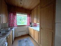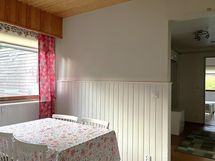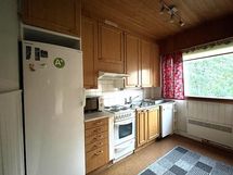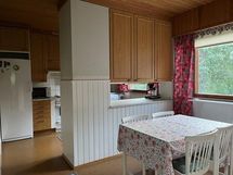 - Keittiössä on jääkaappi, sähköliesi, liesituuletin ja mukavasti työtasoa ja kaapistoja. Keittiö on jaettu kiinteällä kaapistolla ruoanlaittopaikaksi ja ruokailutilaksi.