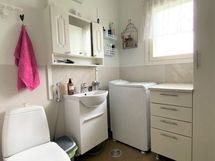 - Sauna, sähkökiuas, kylpyhuone, erillinen wc, suihku, peilikaappi wc, allaskaappi wc, pesukoneliitäntä wc.